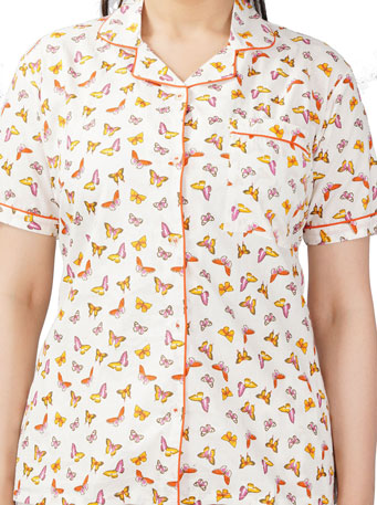 - Style Collared shirt with pocket, front button closure and pyjama / lower with pockets on both sides with elastic & drawstring closure.