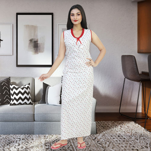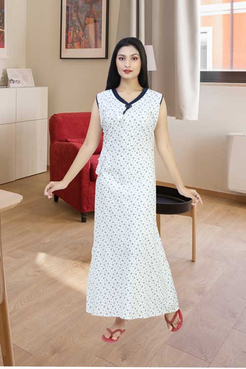 - SIMPLE ELEGANT PRETTY DESIGNS IN VIBRANT COLOURS Our sleeveless cotton nighty for women has been designed in simple, petty designs in vibrant floral designs and colours.